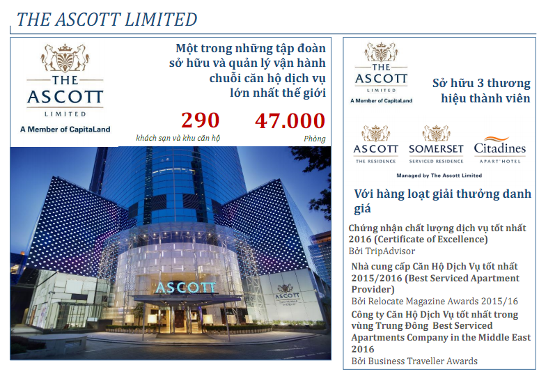 The Ascott Limited, trụ sở chính tại Singapore, là chủ sở hữu đồng thời là nhà điều hành kinh doanh căn hộ dịch vụ quốc tế lớn nhất thế giới. Ascott hiện đang vận hành trên 27.000 phòng căn hộ dịch vụ tọa lạc tại các thành phố lớn của Châu Á - Thái Bình Dương, Châu Âu và Trung Đông cũng như hơn 17.000 phòng đang được triển khai, nâng tổng số phòng lên hơn 45.000 tại hơn 290 khu căn hộ.